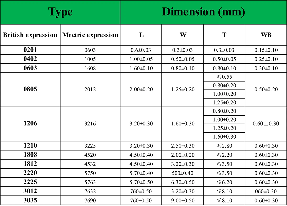 DIP: 0201, 0402, 0608, 0805, 1206, 1210, 1808