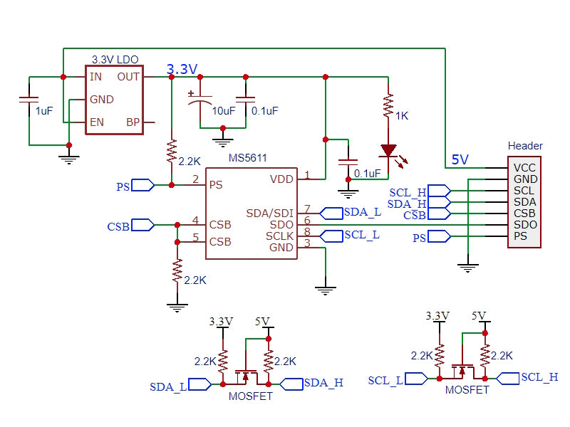 Internally the MS5611 sensor operates at 3.3V, but the module contains a 3.3V regulator so the module should be supplied with 5V on the VCC pin. The module also includes level shifting MOSFET transistors on the logic pins to make the module fully 5V compatible.