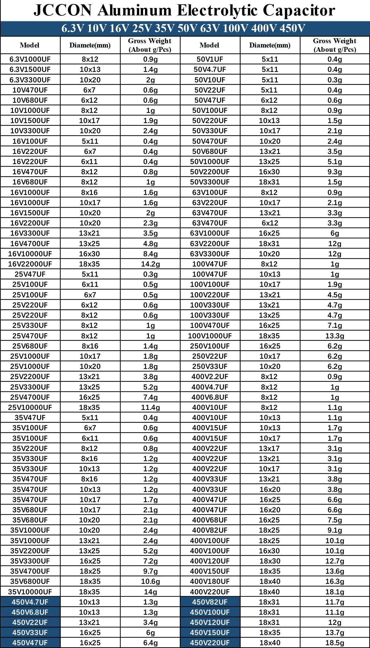 6.3V 10V 16V 25V 35V 50V 63V 100V 400V 450V