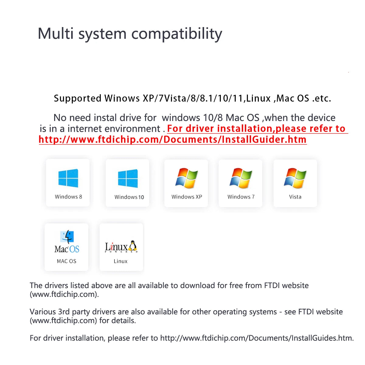 Drivers are available which allow FTDI devices to work with the following operating systems: