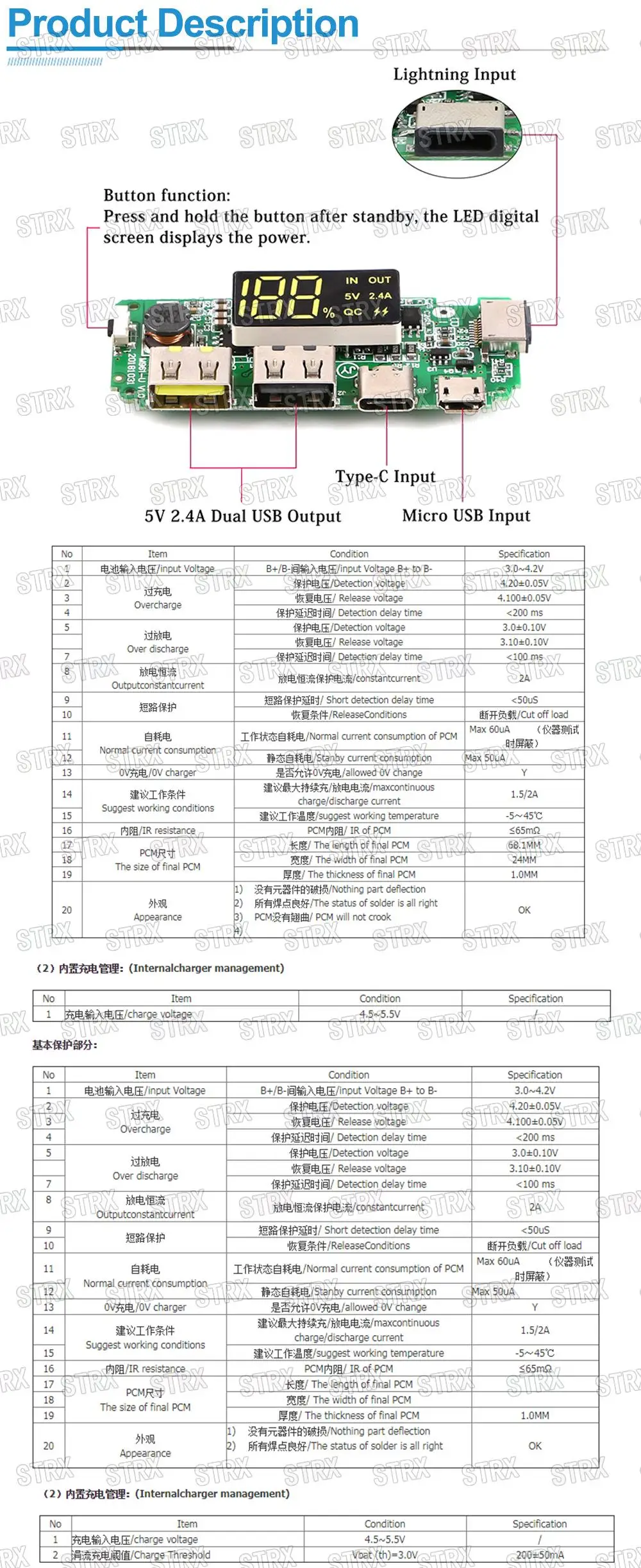 LED Dual USB 5V 2.4A Micro/Type-C Mobile Power Bank Charging Module with 18650 Lithium Battery Protection