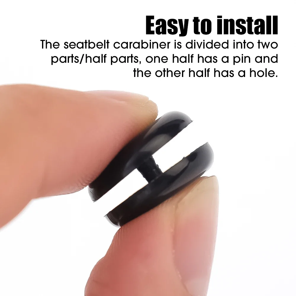 The seatbelt carabiner is divided into two parts/half parts, one half has a pin and the other half has a hole.
