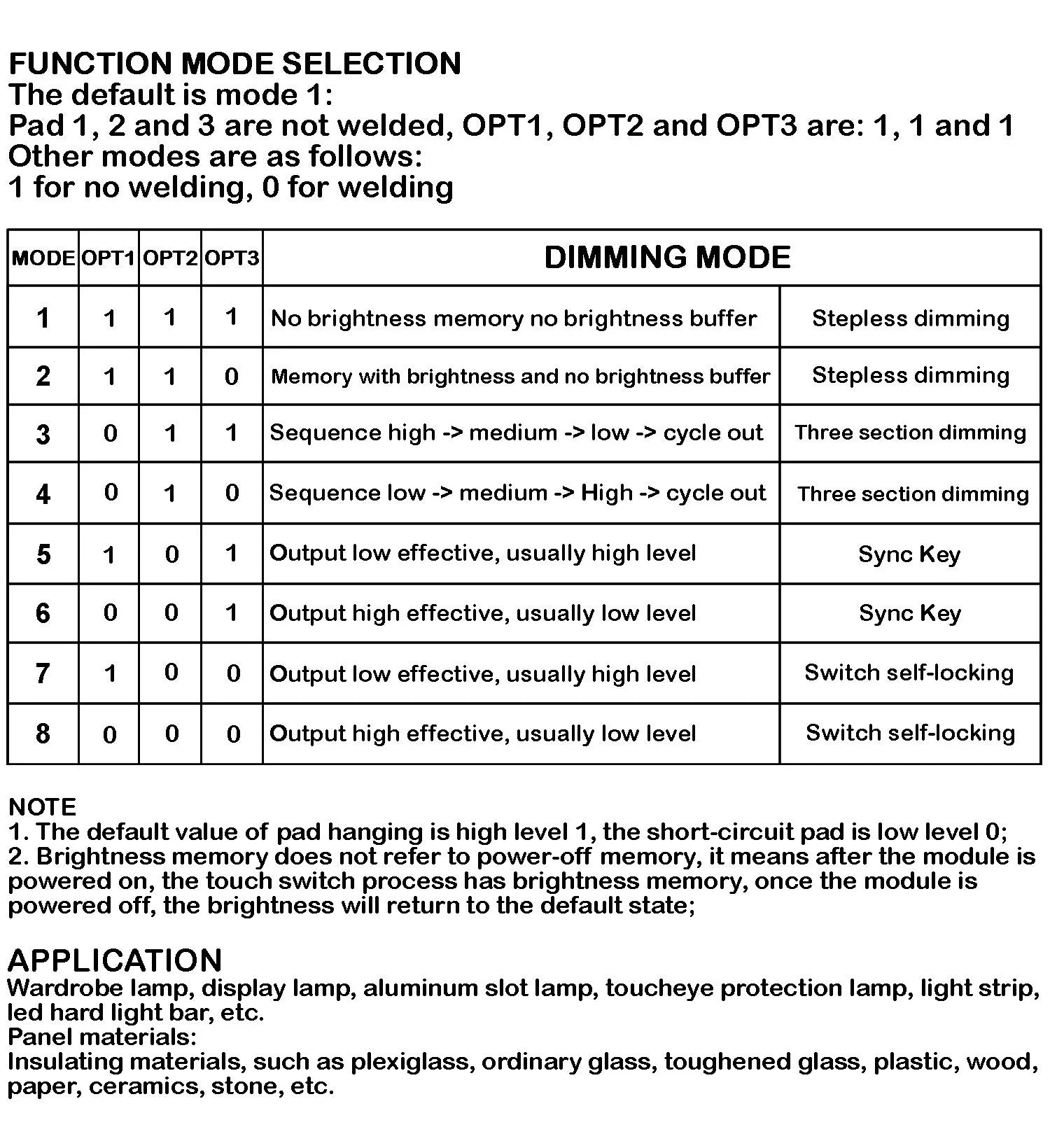 - lt can replace the mechanical light touch button, using this module can realize the touch switch control and brightness adjustment of LED light.